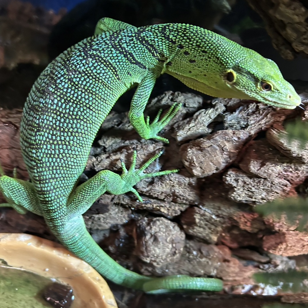 它的特点是鲜艳的绿色体色和黑色条纹图案。它是一种生活在树上的树栖蜥蜴。它的身体构造非常适合树上生活。其显著特征包括体色和用来支撑身体的锋利爪子。